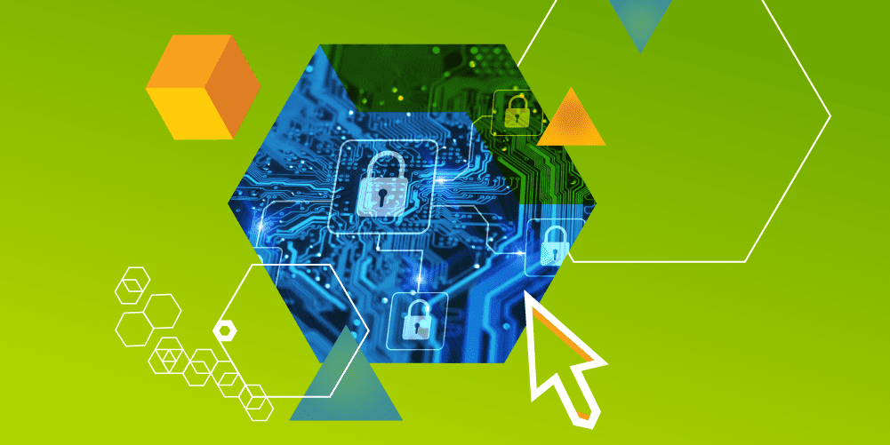 A hexagonal digital circuit board with padlock icons and a cursor, on a green background with geometric shapes.