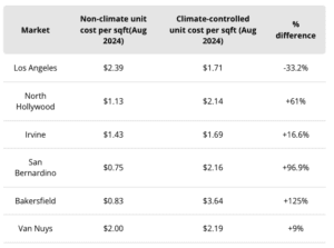 Below is a comparison of climate-controlled vs non-climate controlled storage units for the most recent month of available data for various markets in the L.A. metropolitan area. As you can see, the cost of climate-controlled storage units is typically more expensive than units without climate control.